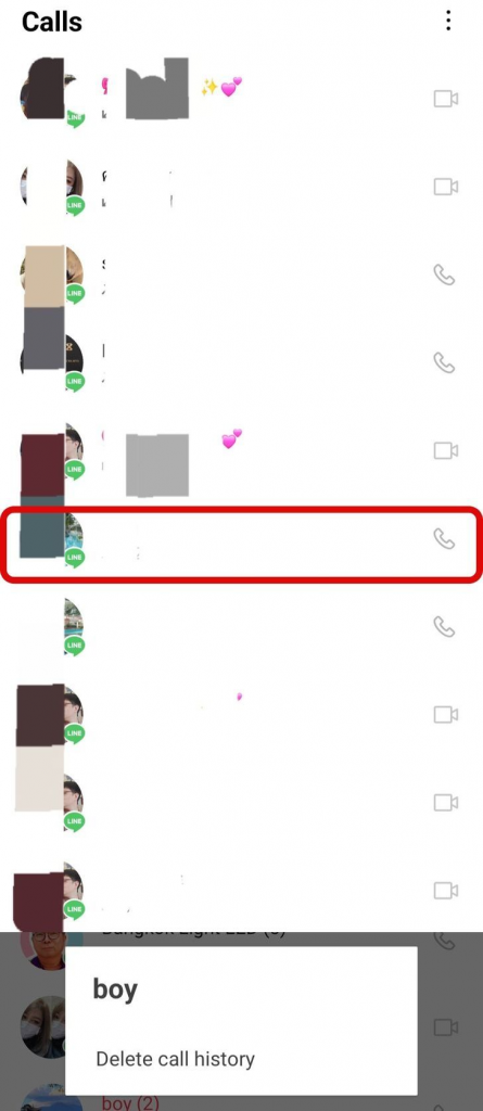 - ในหน้าประวัติการโทร ให้เลื่อนหา ชื่อ หรือ เบอร์โทรศัพท์ ที่ต้องการลบ