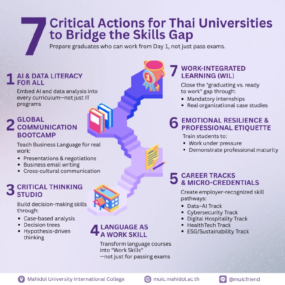 “เพื่อตอบโจทย์ความต้องการของตลาดแรงงานที่เปลี่ยนแปลงอย่างรวดเร็ว MUIC ได้นำร่องปรับหลักสูตรใหม่ 17 สาขา ครอบคลุมทั้งสายวิทยาศาสตร์ เทคโนโลยี บริหารธุรกิจ และศิลปศาสตร์ โดยมีเป้าหมายเพื่อปั้นบัณฑิตให้ ‘พร้อมทำงานจริง’ (Workplace Readiness) เราได้บูรณาการทักษะจำเป็นแห่งยุค AI และดิจิทัลเข้าไปในหลักสูตร และส่งเสริมการเรียนรู้ตลอดชีวิตผ่านระบบ I-Design Elective ที่นักศึกษาสามารถเลือกเรียนวิชาเสริมเพื่อสร้างทักษะเฉพาะตัว เรามั่นใจว่าบัณฑิตที่จบจากหลักสูตรใหม่นี้จะตอบโจทย์ความต้องการของตลาดแรงงานแห่งอนาคต ศาสตราจารย์ แพทย์หญิงจุฬธิดา กล่าวทิ้งท้าย