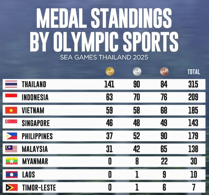 สรุปเหรียญ ซีเกมส์ 2025 นับเฉพาะกีฬาสากลที่มีแข่งขันในโอลิมปิกเกมส์เท่านั้น