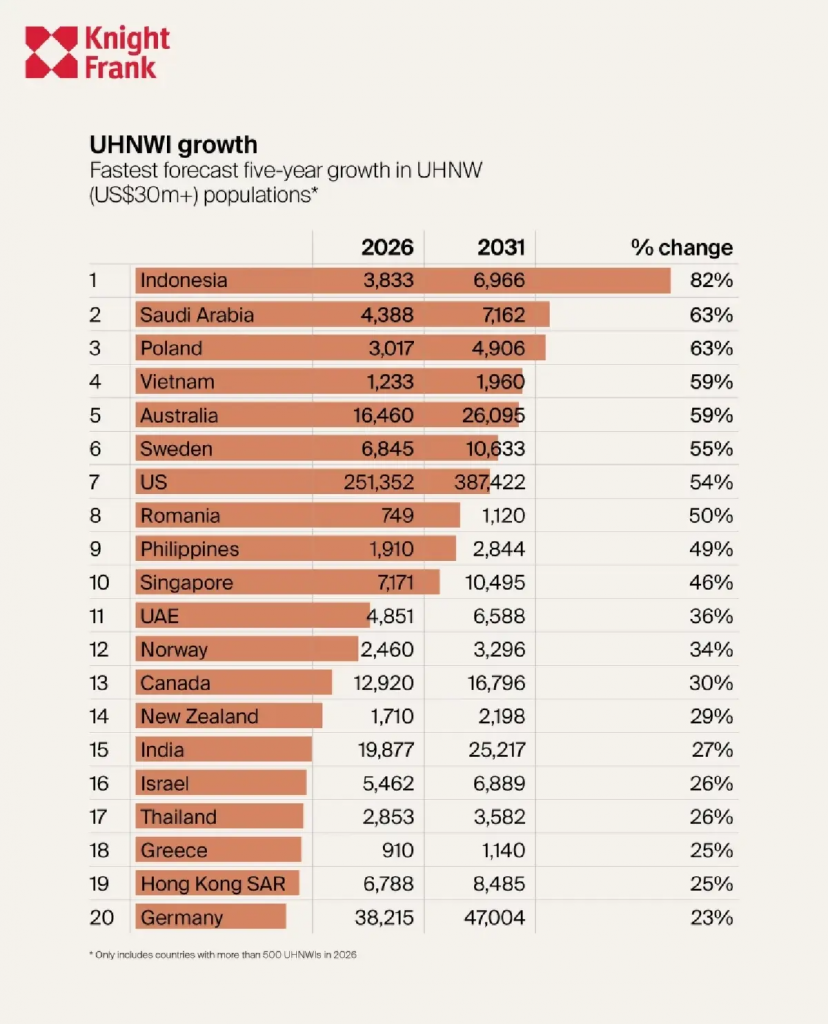 Liam Bailey Global Head of Research Knight Frank กล่าวว่า เรากำลังเห็นหนึ่งในความเปลี่ยนแปลงด้านการกระจายความมั่งคั่งครั้งสำคัญที่สุดในประวัติศาสตร์ยุคใหม่ สหรัฐฯ ยังคงเป็นเครื่องจักรหลักในการสร้างความมั่งคั่งของโลก