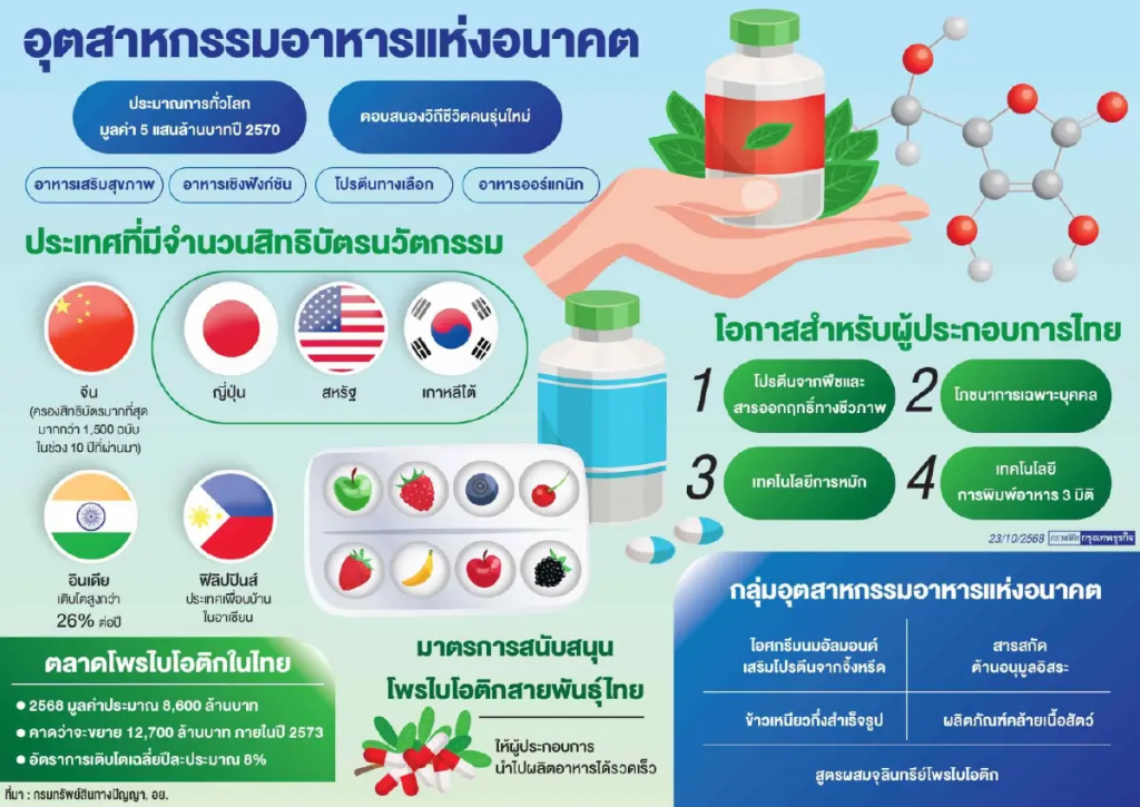 จากข้อมูลสิทธิบัตรทั่วโลกชี้ให้เห็นว่า อุตสาหกรรมอาหารแห่งอนาคต หรืออาหารที่ปลอดภัยเป็นประโยชน์ต่อสุขภาพ ตอบสนองวิถีชีวิตคนรุ่นใหม่ เช่น อาหารเสริมสุขภาพ อาหารเชิงฟังก์ชัน (Functional Food) โปรตีนทางเลือก และอาหารออร์แกนิก เป็นต้น และสารออกฤทธิ์ทางชีวภาพมีการเติบโตอย่างรวดเร็วในช่วงหลายปีที่ผ่านมา