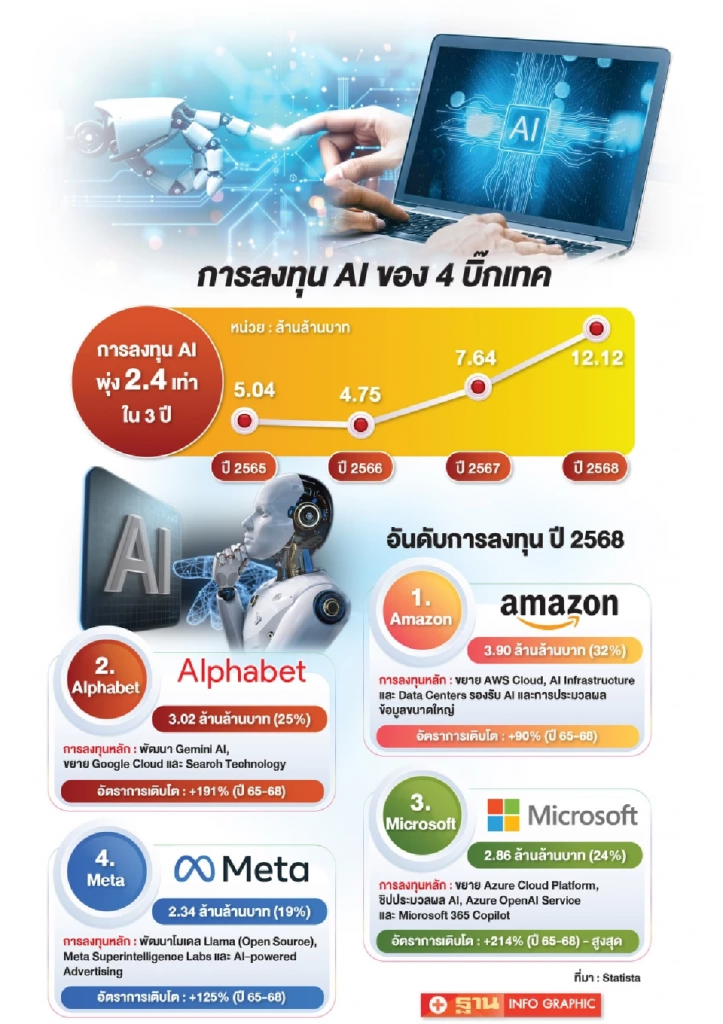 • 4 บริษัทเทคโนโลยียักษ์ใหญ่ของสหรัฐฯ (Amazon, Alphabet, Microsoft, Meta) คาดว่าจะทุ่มงบลงทุนด้าน AI รวมกันสูงถึง 12.12 ล้านล้านบาทภายในปี 2568