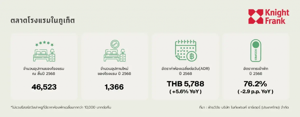 - แอสเซทไวส์และไนท์แฟรงค์ชี้ว่าภูเก็ตเป็นทำเลศักยภาพสูงในการลงทุนโรงแรม เนื่องจากเป็นเมืองท่องเที่ยวระดับโลกที่มีตลาดนักท่องเที่ยวหลากหลายและมีกำลังซื้อสูง ช่วยสร้างเสถียรภาพในระยะยาว