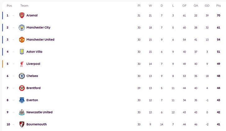 โดยหลังจากแข่งขันกันไปครบทุกคู่ในสัปดาห์นี้ “ปืนใหญ่” อาร์เซนอล ยึดจ่าฝูงได้เหนียวแน่นด้วยการมี 70 คะแนน นำห่าง “เรือใบสีฟ้า” แมนฯ ซิตี้ อันดับ 2 ออกไปเป็น 9 คะแนน แต่แข่งมากกว่าอยู่ 1 เกม